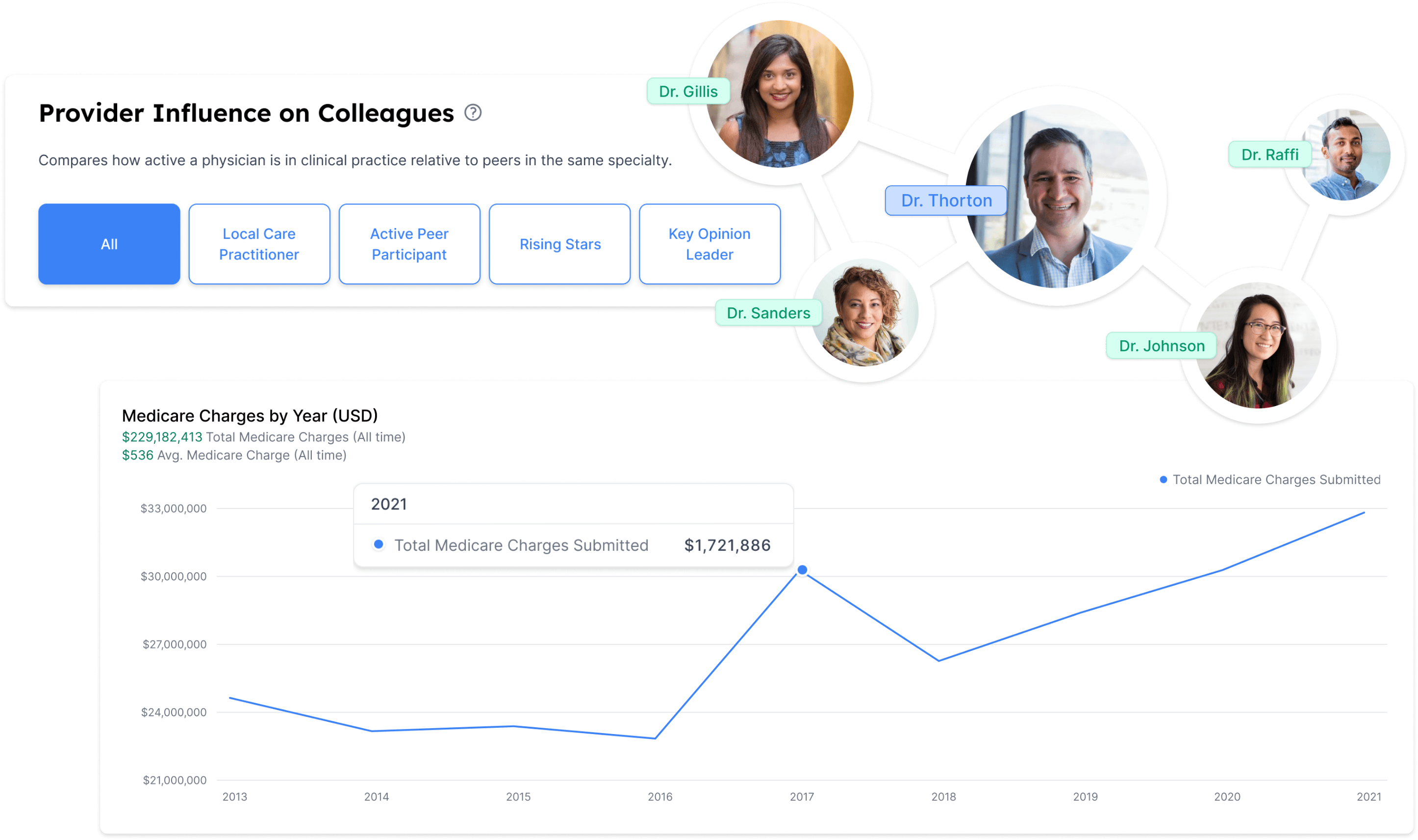 By harnessing comprehensive data on prescribing trends, procedures, industry payments, journal articles, and upcoming lectures you can pinpoint rising leaders and decision makers.